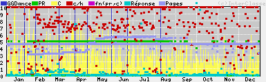 c/k : rapport entre la quantitié de pages visitées par Google et le nombre depages connues par Google (k comme konnu ;). La variation des valeurs fluctue comme la courbe C dont elle dépend. L'échelle est sur une base 100, une valeur 100 correspond donc à un nombre de pages crawlées identique au nombre de pages connues.